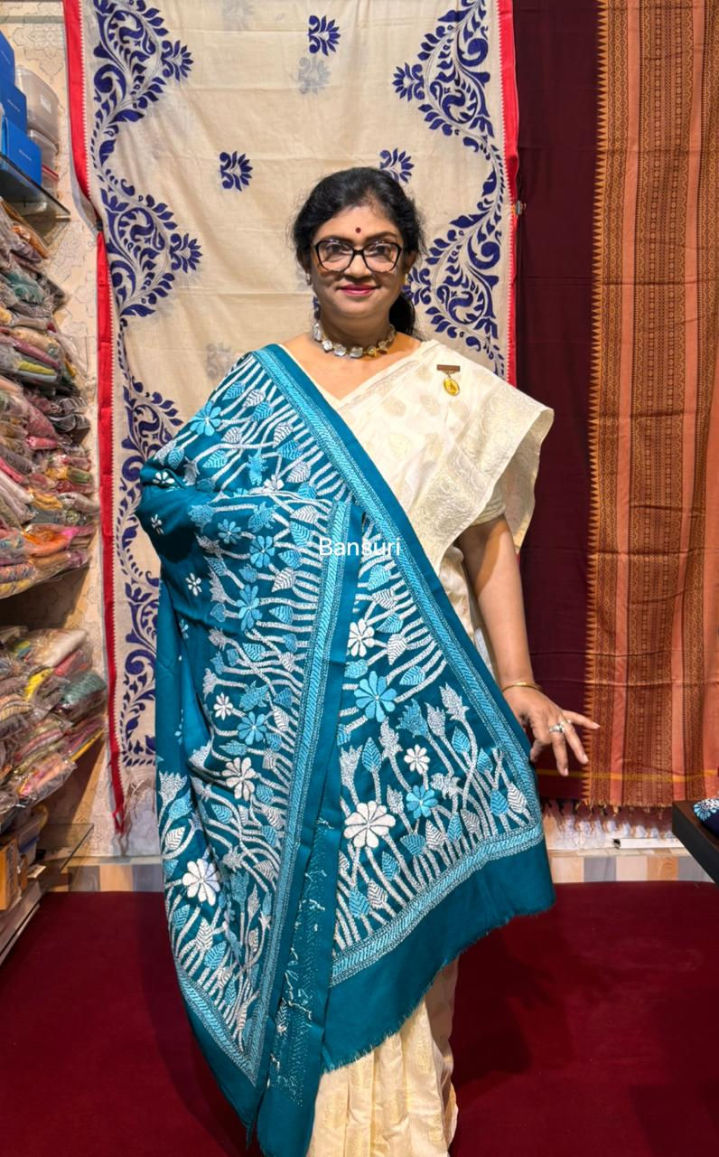 Pure Woolen Kantha Stitch Shawl Royal Blue & Sky