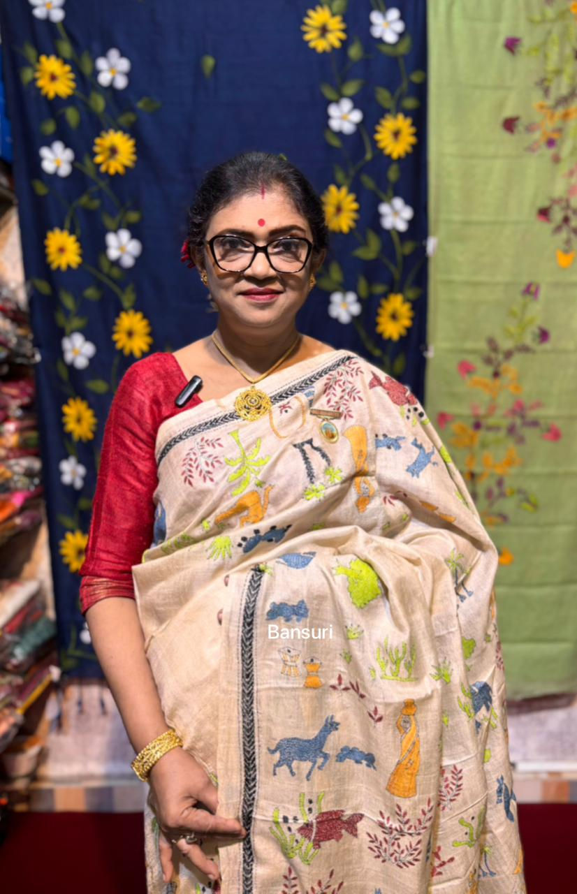 Pure Gachi Tussar Kantha Stitch Saree Beige & Multicolored